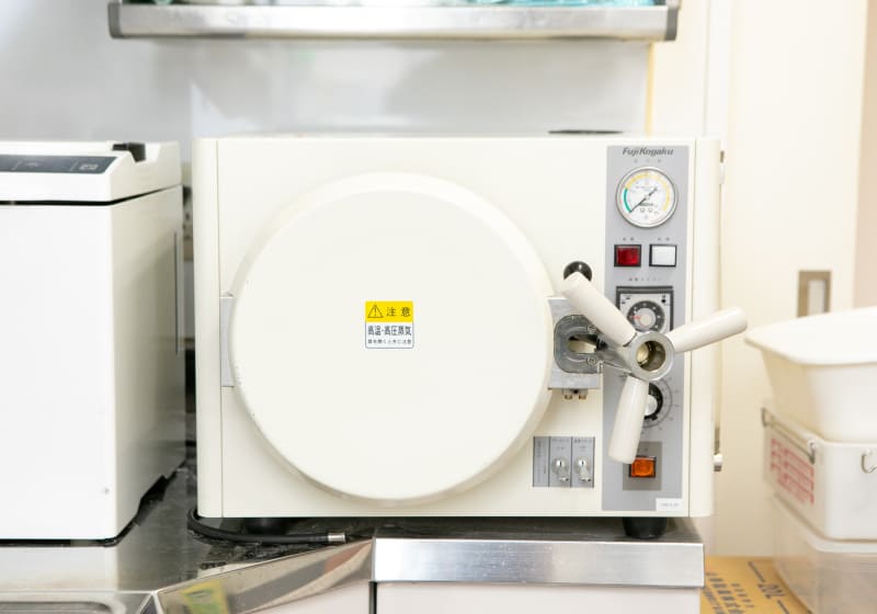 オートクレーブという滅菌の機械です。滅菌は消毒よりも衛生的です。これですべての微生物を死滅させます。もちろん手袋、エプロン、紙コップ、紙バットは患者様ごとに使い捨てですので、ご安心下さい。