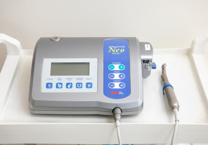 インプランターとは、インプラントを埋入する時に使用するインプラント手術には欠かせない機械です。インプラントの手術は骨を削ったりするので、歯を削る機械と同じ機械で削ってしまうと骨は死んでしまいます。そこで低速で骨を削れる機械がインプランターです。