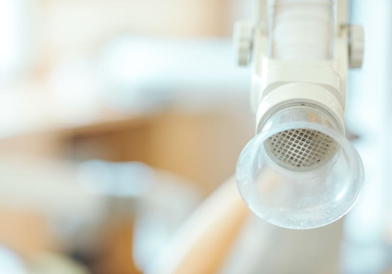 治療中に発生する水しぶきや唾液、金属片などを口腔外で効果的に吸引することができます。空気中に浮遊するウイルスなどの感染性物質を吸引できるので、感染予防対策を行う上で欠かすことができません。また、治療時に生じる不快なにおいも除去し、快適な環境を提供いたします。